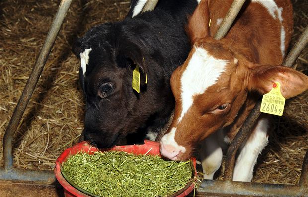 Was bei den Kühen gang und gäbe ist, kommt auch bei den Kälbern: eine Mischration. Allerdings enthält das Mash keine Silage, sondern Heu, Luzerne und Aufzuchtfutter. Die konstante Qualität fördert die Entwicklung.