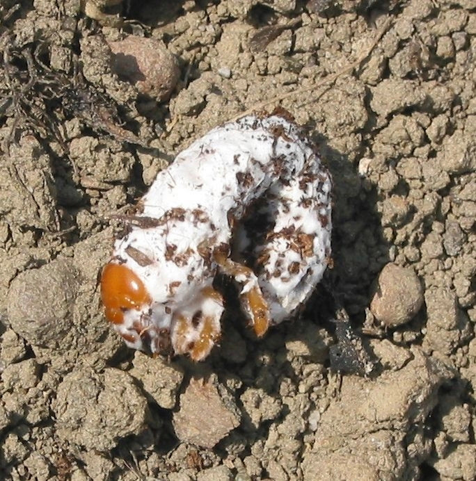 Pilz hat den Engerling befallen und getötet.