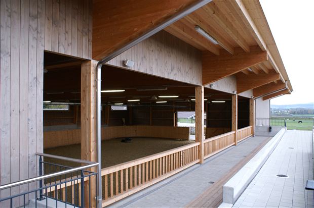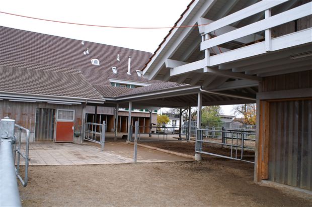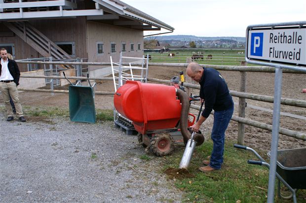 In den Gebäuden, im Laufhof und auf den Weiden fällt die Sauberkeit auf. Der Betrieb verfügt über eine ausgeklügelte Entmistungsanlage: In jeder Liegeboxe befindet sich ein abgedeckter Schacht, aus dem der eingeworfene Mist – schwupps – durch ein unterirdisches Absaugsystem nach draussen in eine geschlossene Mulde befördert wird. Das spart Muskelkraft, erlaubt schnelles Misten und bekämpft wirksam die Geruchs- und Fliegenplage. Auch auf der Weide werden die Rossäpfel mit dem fahrbaren Saubsauger «Elephant» aufgelesen.