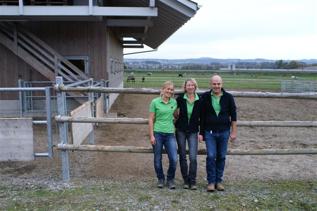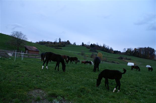Ortswechsel: Das vor fünf Jahren von Corinne Sélébam und Simon Alt gegründete Sportpferdezentrum Rietenberg hat sich bereits einen Namen für Schweizer Warmblut- Dressur- und Springpferde gemacht. Der Familienbetrieb verfügt über eine Nutzfläche von 14 Hektaren, knapp die Hälfte sind Weiden in sanfter Hanglage. Hier finden 45 Pferde in Gruppen und Herden artgerechte Bedingungen. Auffallend war, wie neugierig, aber ruhig, ja zutraulich die Tiere auf die fremden Besucher in den Ställen reagierten.