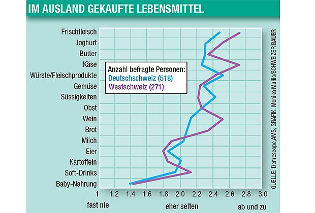 Fleisch und Käse werden am häufigsten ennet der Grenze gekauft. Romands kaufen auch ab und zu Wein im Ausland ein.