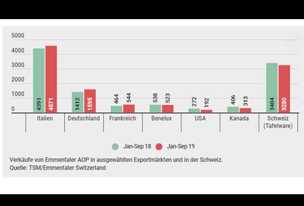 Besonders gut sieht es im Export aus, wie von Emmentaler Switzerland präsentierte Zahlen aufzeigen. So stiegen die Verkäufe zwischen Januar und September dieses Jahres in den wichtigsten Auslandmärkten Italien, Deutschland und Frankreich allesamt an. Die Gesamtexporte legten um 2,7 Prozent auf 8'276 Tonnen zu. Dies trotz des starken Frankens.