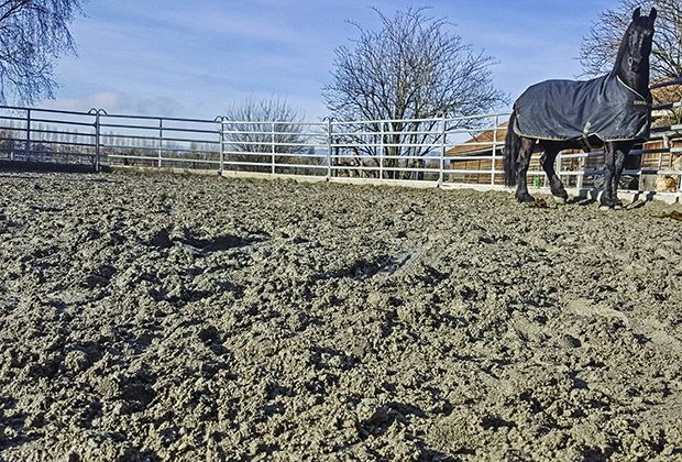 Wenn sich die Tiere nur stundenweise frei im Auslauf bewegen können, ist die Tendenz gross, dass sie galoppieren und herumtoben. Deshalb muss der Boden elastisch sein und eine relativ tiefe Tretschicht aufweisen, zum Beispiel aus gewaschenem Sand.