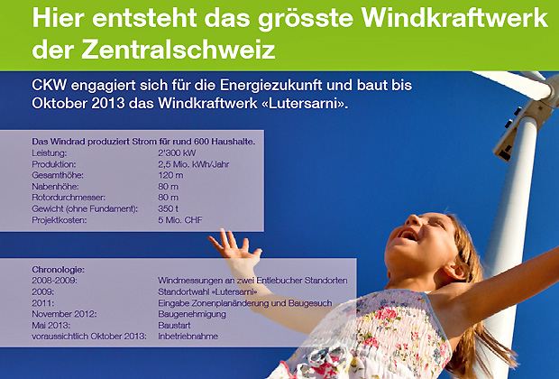 Die Centralschweizerische Kraftwerke AG (CKW) hat mit dem Bau des grössten Windkraftwerks der Innerschweiz begonnen. Dieses soll ab Herbst 2013 rund 600 Haushalte mit Strom aus erneuerbarer Energie versorgen. Eine neue Trafostation soll zudem die Versorgungssicherheit in der Region stärken.