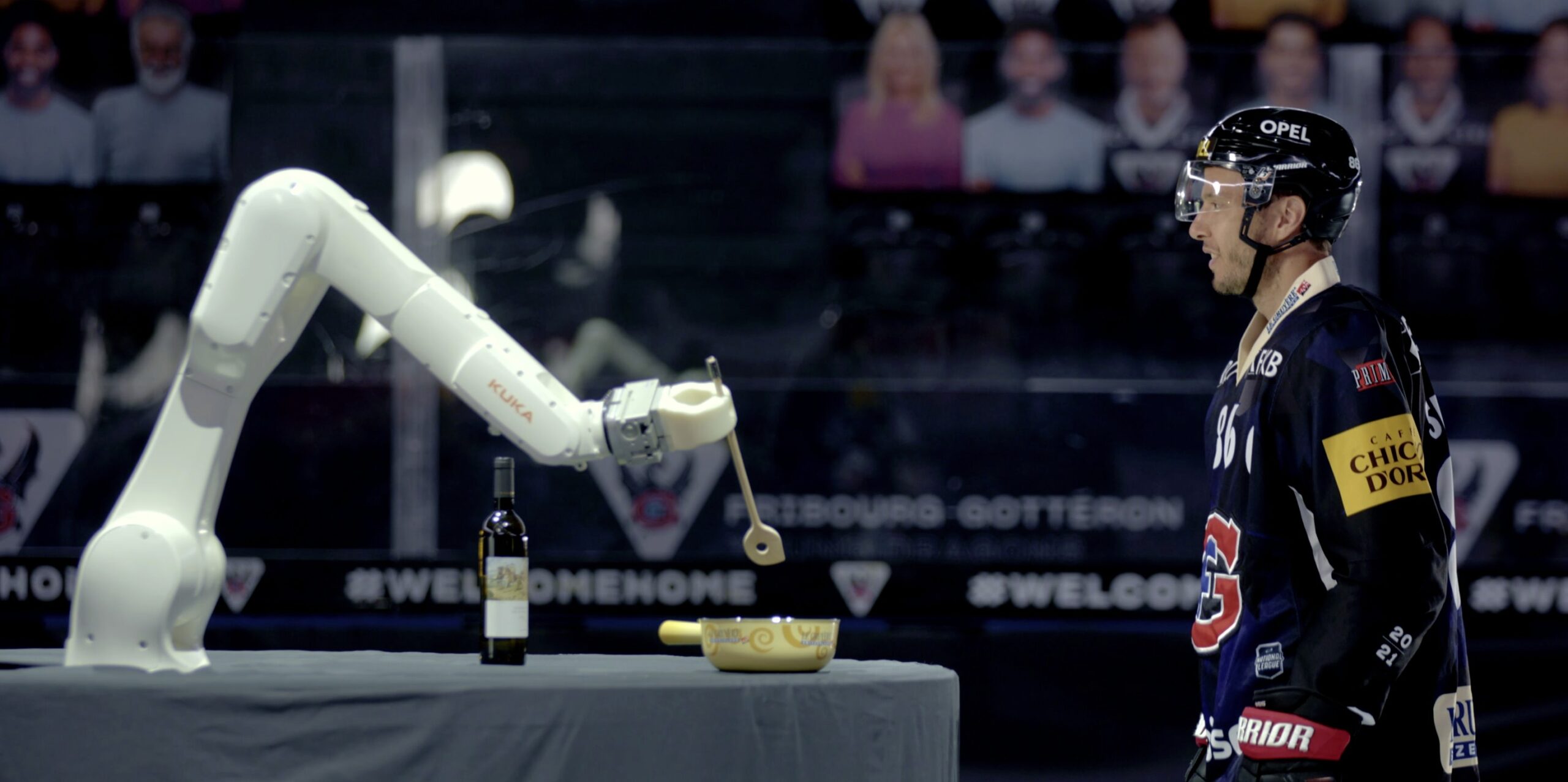 Bouébot ist der weltweit erste Roboter, der sich mit Fondue auskennt. Seine Fertigkeiten wird er erstmals am Salon de l’Agriculture in Paris zeigen. Ein witziges Video mit Gottéron-Captain Julien Sprunger und Bouébot gibt einen ersten Einblick.