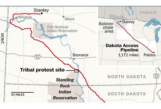 Hintergrund: North Dakota baut eine Pipeline. Sie soll Öl von den tausenden Frackingbohrstellen im Norden in den Bundesstaat Illinois transportieren, jeden Tag über 450'000 Barrel. Die Röhre soll insgesamt fast 1900 Kilometer lang sein und rund 2,7 Milliarden US-Dollar kosten.