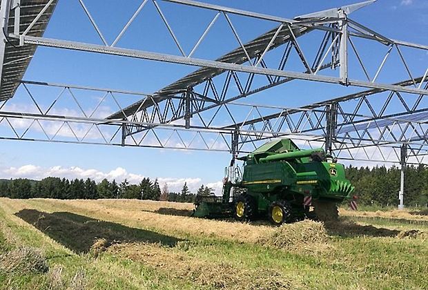 Als Testkulturen wurden auf der Versuchsfläche Winterweizen, Kartoffeln, Sellerie und Kleegras angebaut. Durch einen grösseren Reihenabstand zwischen den bifazialen Glas-Glas-Solarmodulen in 5 m Höhe und die Ausrichtung nach Südwesten wurde sichergestellt, dass die Nutzpflanzen gleichmässig Sonnenstrahlung erhielten.