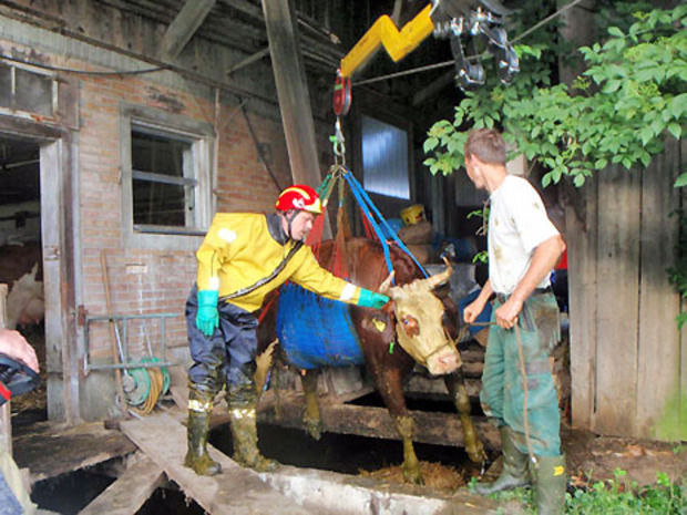 Die vier Männer der Berufsfeuerwehr und der Bauer konnten die Kuh mittels einem Tierhebenetz und einem Hydraulikkran innerhalb einer Stunde aus der Jauchegrube bergen. Die Kuhdame hatte grosses Glück. Beim Sturz zog sie sich lediglich einige leichte Schürfwunden zu.