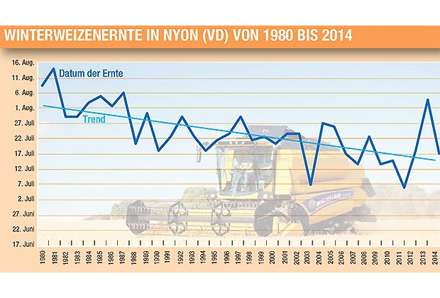 Die Tendenz einer früheren und hektischeren Erntekampagne bestätigt Dario Fossati von Agroscope. In der Schweiz sei sie noch extremer, und zwar bei Gerste, Triticale und Weizen: «Der Winterweizen in unseren Versuchen in Nyon VD wurde in den 80er-Jahren im Schnitt Anfang August gedroschen. In den letzten Jahren fuhren die Mähdrescher schon Mitte Juli auf. Dass die Getreideernte am 1. August praktisch abgeschlossen ist, gab es früher nie.» Die Versuchsdaten (siehe Grafik) stimmen laut Fossati ziemlich gut mit den in der Praxis üblichen Ernteterminen überein.
