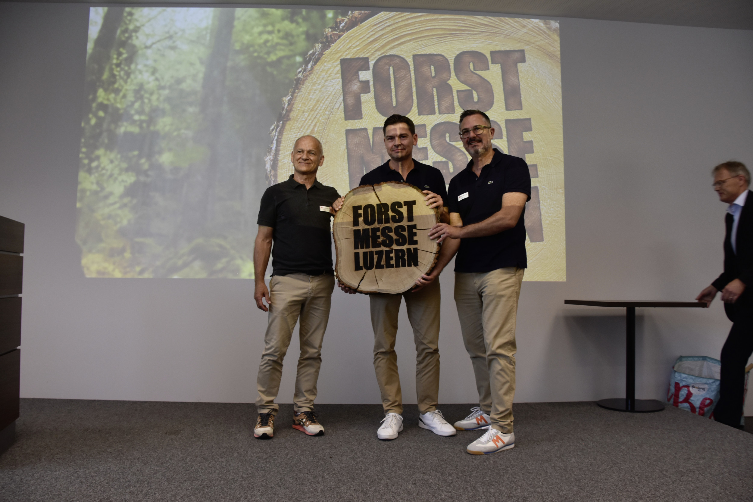 Die Forstmesse-Organisatoren Andreas Hauenstein, Marco Biland, André Biland, (v.l.) freuen sich über das Geschenk von Kanton und Korporation Luzern.