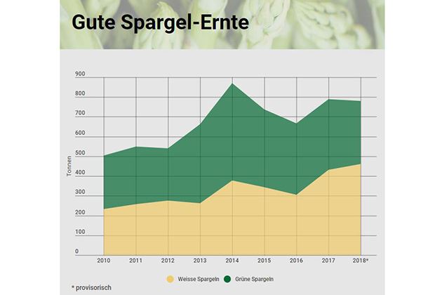 2018 wurden 780 Tonnen Spargeln geerntet. Weisse Spargeln verzeichneten mit 460 Tonnen einen Rekord. Bei den grünen Spargeln fiel die Ernte mit 320 Tonnen rund 10 Prozent kleiner aus als im Vorjahr. Der Marktanteil der Schweizer Spargel ist aber immer noch tief. Dieser liegt bei rund 7 Prozent.