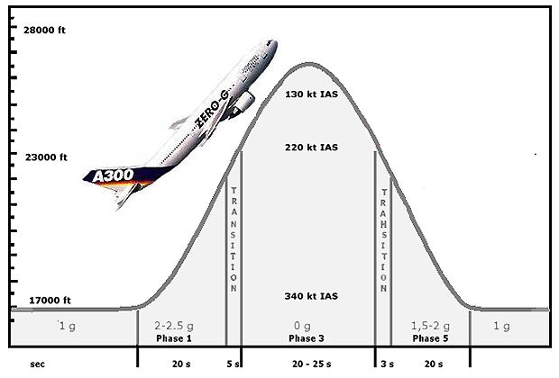 Der Flug vom Dienstag dauerte drei Stunden und führte in dafür reservierte Zonen über dem nördlichen Mittelmeer. Dort flog die Maschine sogenannte Parabeln - abwechselnde steile Aufstiege und Sinkflüge. In der Phase vor und nach Erreichen des höchsten Punktes herrscht im Flugzeug Schwerelosigkeit.