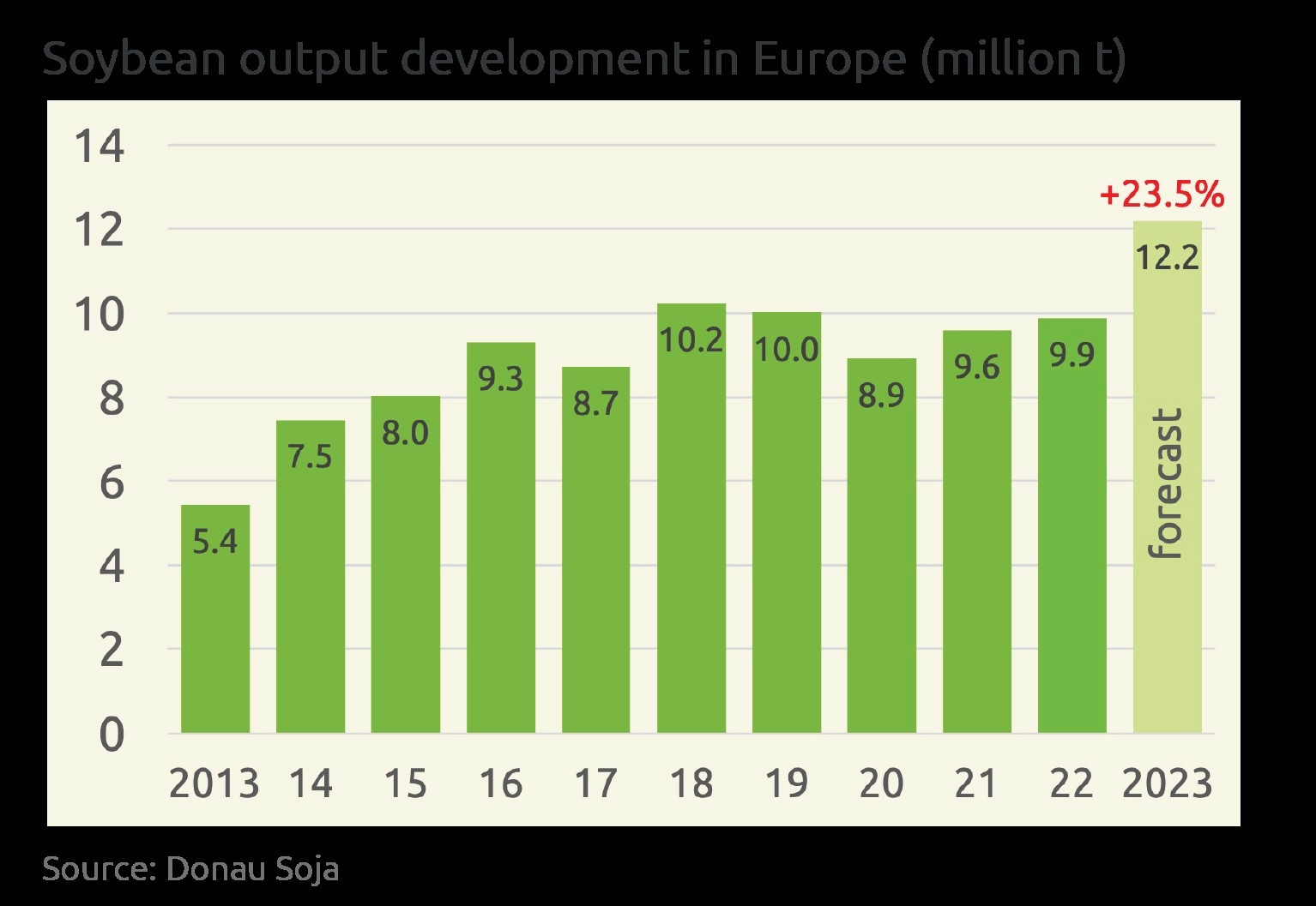Obwohl die Anbauflächen (Österreich minus 6,4 %; Deutschland minus 12,8%) heuer zurück gingen, erhöhte sich die Erntemengen um 9,4 % (Österreich) bzw. um 9,6 % (Deutschland). Die Ernte in Deutschland beträgt heuer 140’000 Tonnen, in Österreich 267’000 Tonnen. Damit produziert Österreich fast doppelt so viel Soja wie Deutschland. Für 2024 erwartet sich Donau Soja angesichts der günstigen Entwicklungen eine Ausdehnung der Anbauflächen.