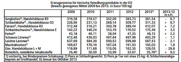 Die tierhaltenden Betriebe in der EU haben sich 2013 vielfach über höhere Verkaufserlöse für ihre Produkte freuen können. Wie aus aktuellen Daten der EU-Kommission hervorgeht, bewegten sich die Produzentenpreise auf einem überdurchschnittlichen Niveau. Teilweise konnten die Rekordwerte des Vorjahres nochmals übertroffen werden.