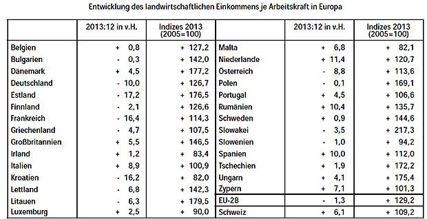 Diese Zahl ist pessimistischer als die Einschätzung des Deutschen Bauernverbands (DBV), der in seinem jüngsten Situationsbericht für das Kalenderjahr 2013 von einer um nominal 1,8% geringeren Nettowertschöpfung je Arbeitskraft ausgeht. Dieser Wert entspricht nach Auskunft des DBV einer realen Verringerung um 4%. Grund für die Diskrepanz dürften unterschiedliche Datengrundlagen und Ausgangsschätzungen sein. Das ändert nichts daran, dass die deutschen Haupterwerbsbetriebe im Wirtschaftsjahr 2012/13 ein kräftiges Plus im Unternehmensergebnis erzielen konnten.