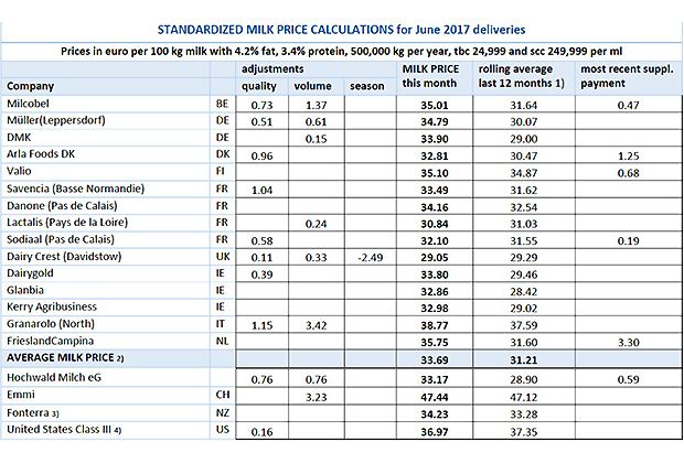 Das deutsche Milchkontor (DMK), welches aufgrund tiefer Milchpreise einen Drittel seiner Milchmenge verlieren wird, erhöhte im Juni den Produzentenpreis um 1 Cent auf 33.90 Ct/kg (38.65 Rp.). Auf dem letzten Rang im Ranking liegt die irische Molkerei Dairy Crest. Sie zahlte ihren Bauern einen Milchpreis von 29.05 Cent (33.10 Rp.). Die Iren ist auch die einzige Molkerei, welche im Juni den Milchpreis senkte (-1.6 Cent). Auf dem zweitletzten Rang liegt die französische Lactalis mit 30.84 Ct (35.15 Rp.).