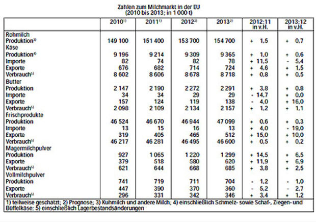 Für das Kalenderjahr 2012 erwarten die Experten gegenüber 2011 einen Anstieg der Milchproduktion um 2,3 Mio. t (+1,5%) auf 153,7 Mio. t. 2013 soll die Produktion nur noch um 1 Mio. t (+0,7%) auf 154,7 Mio. t ansteigen.