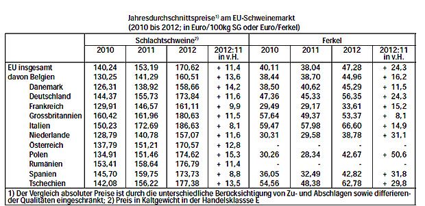 Wie aus Daten der EU-Kommission hervorgeht, stieg der durchschnittliche Schlachtschweinepreis in der EU vergangenes Jahr gegenüber 2011 um 17,43 Euro/100 kg (20,9 CHF/kg) Schlachtgewicht (SG) oder 11,4 % auf 170,62 Euro/100 kg (204,75 CHF/kg) in der Handelsklasse E. Das war der höchste Stand seit der EU-Erweiterung im Jahr 1995.
