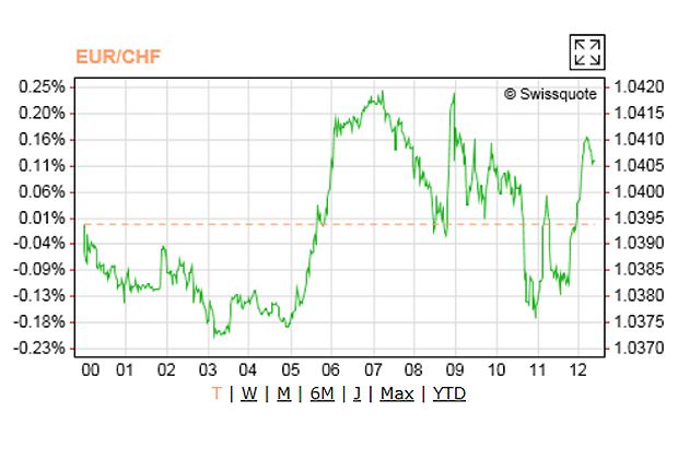 Nachdem der Euro zum Franken bereits in der Nacht mehrere kleinere Sprünge machte und ab 5 Uhr ein relativ steiler Anstieg erfolgte, ging es zunächst wieder etwas nach unten. Gegen 9 Uhr folgte ein neuerlicher Sprung von 1,0390 auf 1,0420 Franken, und auch danach gab es einige Bewegung. Um 11.30 Uhr stand der Euro bei 1,0380 Franken.