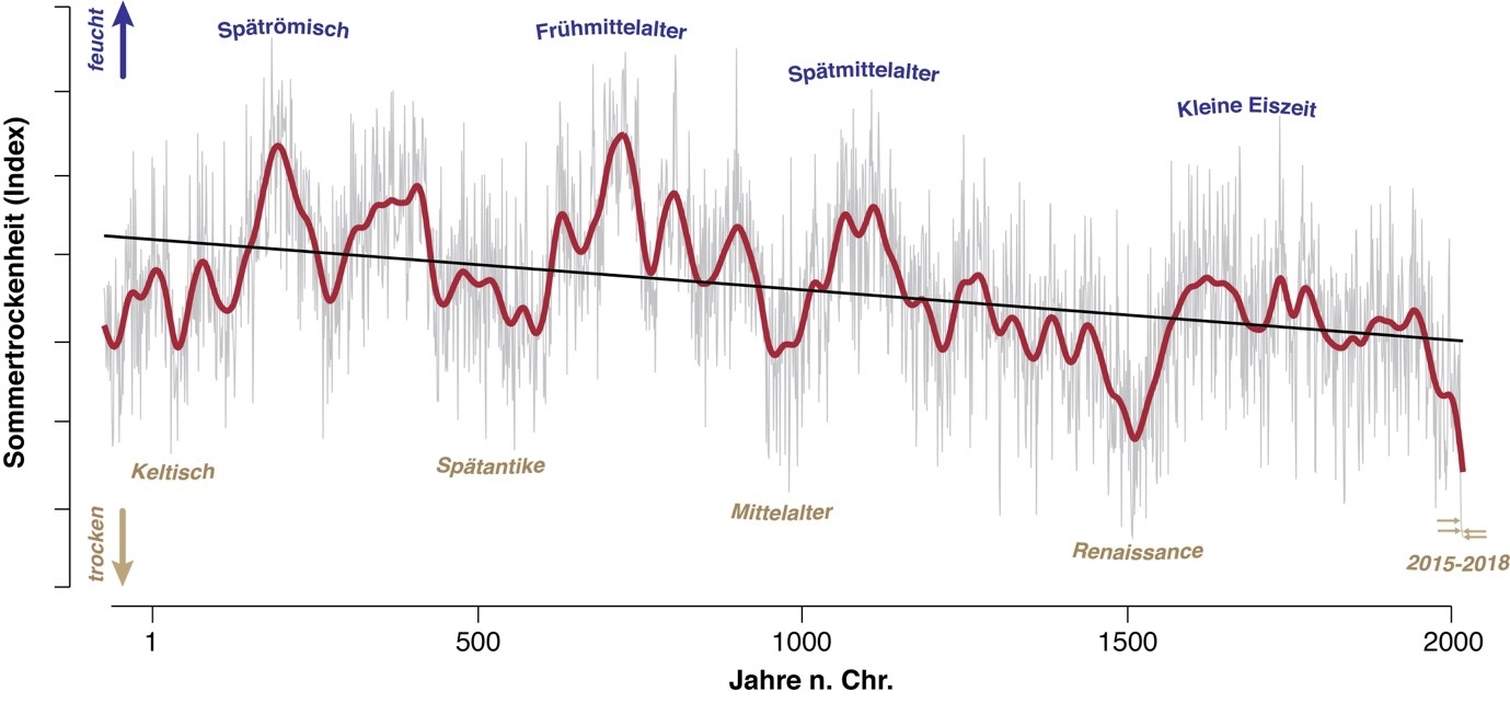 Die Wissenschaftler nutzten ein spezifisches Verfahren zur Analyse von Baumringen und erstellten so einen gewaltigen Datensatz, der die hydroklimatischen Bedingungen in Mitteleuropa von der Römerzeit bis zur Gegenwart abbildet. Die aussergewöhnliche Trockenperiode ist nach Ansicht der Forscher auf den von Menschen verursachten Klimawandel zurückzuführen.