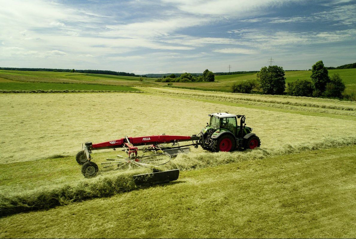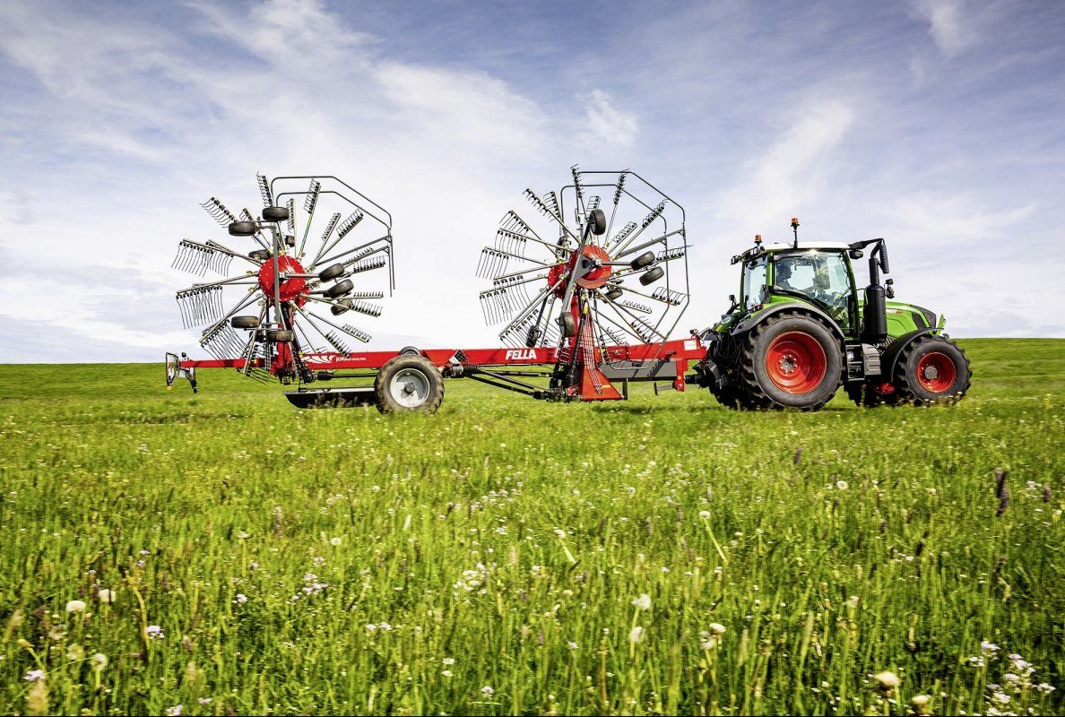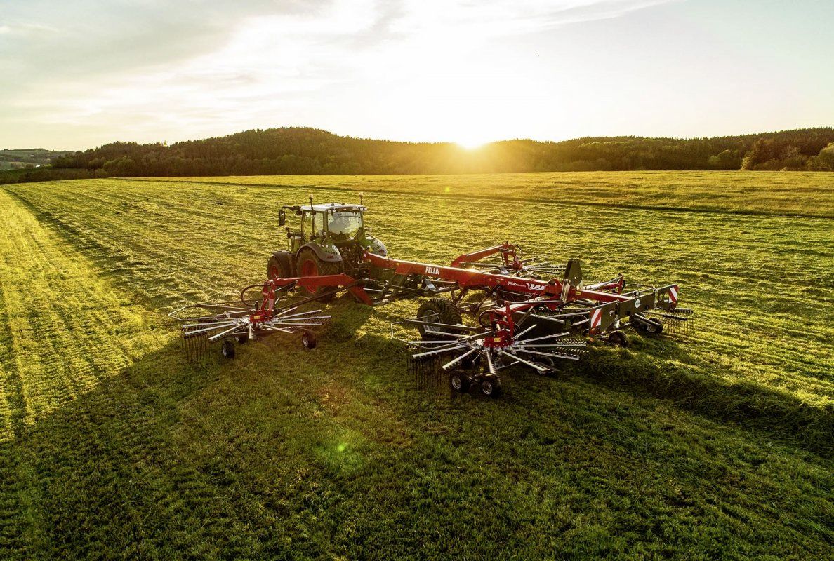 Im neuen Look vereint der Zwei-Kreisel-Seitenschwader gemäss Fella höchste Stabilität und Flexibilität auf bis zu 8,40 m Arbeitsbreite.