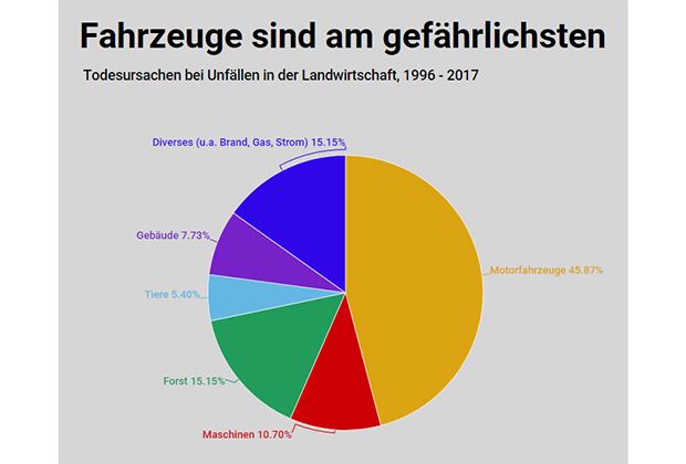 Die Hälfte der Todesfälle geschieht bei der Arbeit mit Maschinen und Fahrzeugen. Fehlende Geländer können zu Stürzen führen. Viele Unfälle geschehen auch im Umgang mit Tieren oder bei der Arbeit im Wald. Früher gab es noch oft Unfälle mit Leitern. Das hat sich gebessert, seit Obstbauern zunehmend auf Niederstamm-Bäume setzen.