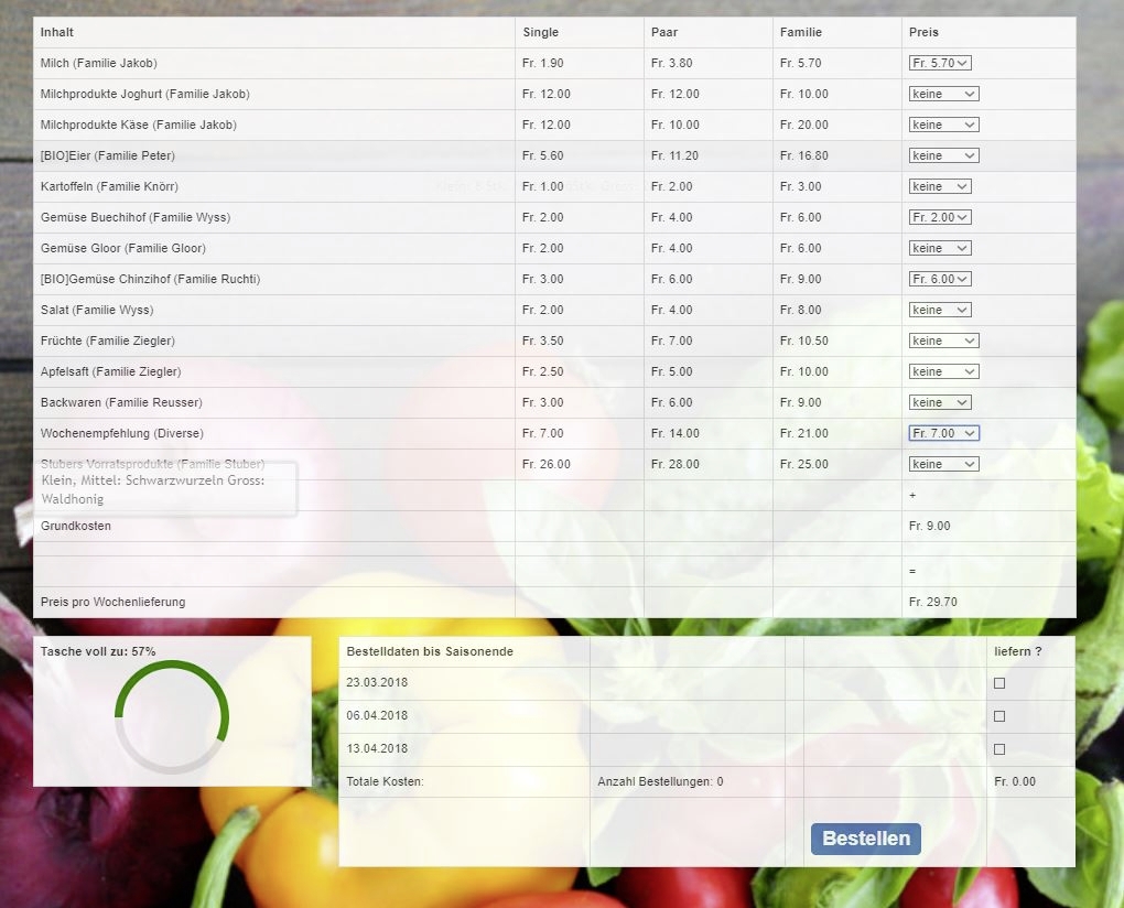 «Wir bieten saisonale Produkte, das heisst, dass zum Beispiel der Blumenkohl im Frühling begrenzt ist», sagt André Ziegler. Zudem sollen die Bauernfamilien einen fairen Preis für ihre Produkte erhalten. «Der Bauer erhält 100% vom Produktpreis, den er selbst festlegen kann», so Ziegler. Pro Tasche wird eine Gebühr von 4.- verrechnet, welche die administrative Arbeit des Regionsleiters entgeltet. Andere Investitionen wie die Arbeit einer Grafikerin werden von den Regionalleitern vorgeschlagen und finanziell von allen Regio-Mitgliedern getragen.