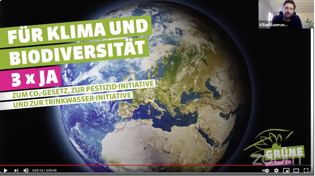Kilian Baumann sagte weiter: «Jetzt wird ja behauptet, die Versorgungssicherheit der Schweiz sei mit den beiden Initiativen gefährdet. Das Einzige, das momentan in einigen Regionen gefährdet ist, ist die Versorgungssicherheit mit sauberem Trinkwasser.» Weiter werde auch versucht, Biobäuerinnen und Biobauern gegen die Initiativen einzusetzen, weil einige Biobauern die Trinkwasser-Initiative nicht unterstützten. An dieser Stelle wies Baumann darauf hin, dass Bio Suisse mit grosser Mehrheit die Ja-Parole zur Pestizidinitiative beschlossen habe. «Und auch die Kleinbauern-Vereinigung unterstützt die Pestizidinitiativen mit einer eigenen Kampagne», so Baumann weiter. Bei den Grünen könne man Flyer und Bio-Baumwolltaschen für die 3x-Ja-Kampagne bestellen, und die Partei werde auch zwei Online-Podien organisieren.