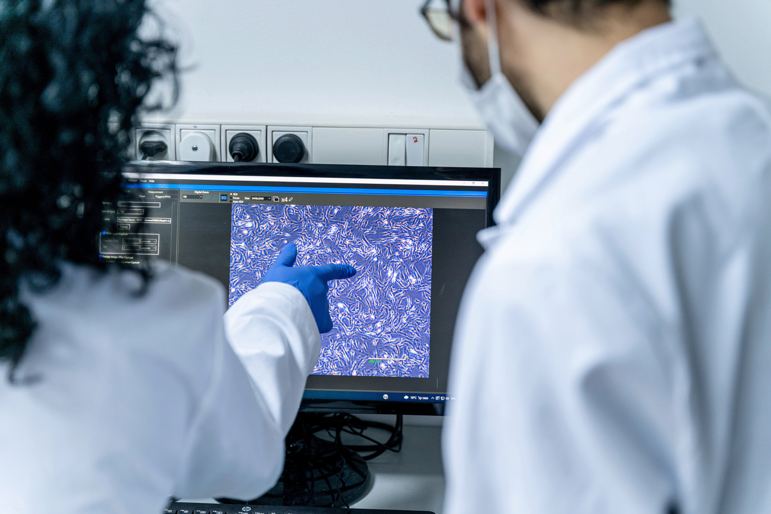 Wissenschaftler von Aleph Farms analysieren kollagenproduzierende Zellen unter dem Mikroskop.