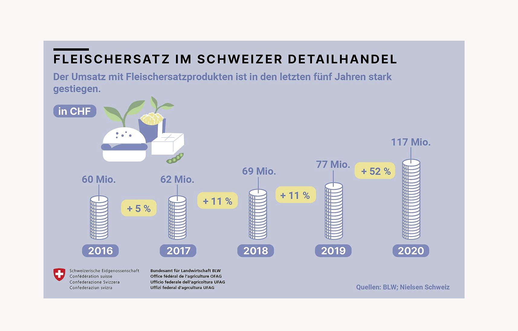 Verschiedene Studien prognostizieren für die nächsten Jahre einen Wachstumstrend für Fleischersatzprodukte. Vor dem Hintergrund des Klimawandels gebe es ein zunehmendes Konsumentensegment, insbesondere bei jüngeren Personen, das bewusst den Fleischkonsum reduziert oder sogar ganz darauf verzichtet, schreibt das BLW.