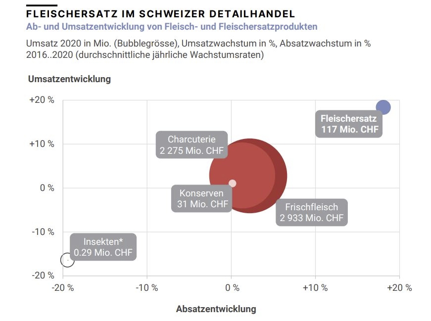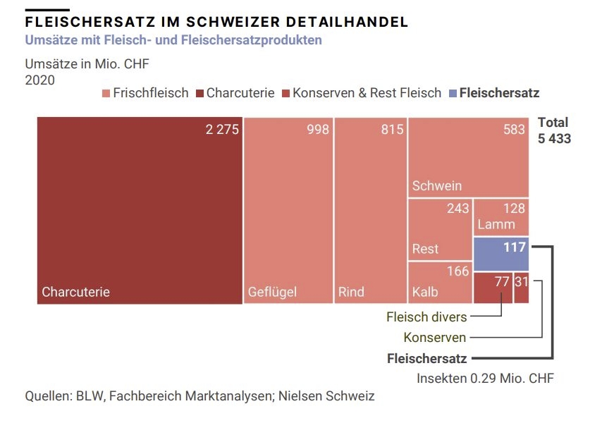 Basierend auf der Auswertung des kombinierten Retail- und Konsumentenpanels von Nielsen Schweiz betrug der Gesamtumsatz von Fleisch- und Fleischersatzprodukten im Schweizer Detailhandel im vergangenen Jahr 5.43 Mrd. Fr. Davon machten Frischfleisch mit 2.93 Mrd. Fr. und Charcuterie mit 2.27 Mrd. Fr. zusammen über 95 % des gesamten Umsatzvolumens aus. Verglichen mit Fleisch handle es sich bei Fleischersatz mit einem Marktanteil von 2,3 Prozent im Detailhandel um ein Nischenprodukt.