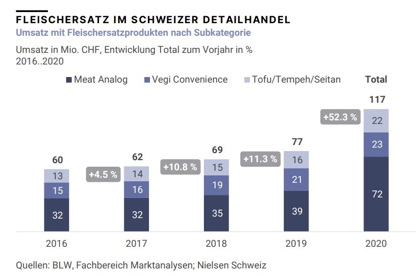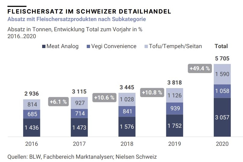 Die höchsten Wachstumsraten verzeichneten laut BLW sogenannte Meat-Analog-Produkte. Der Absatz von Meat-Analog-Produkten ist im 2020 gegenüber 2019 um 74,5 % gestiegen und macht mittlerweile über 50 % des gesamten Absatzes von Fleischersatzprodukten aus. Das sind Produkte, die wie Fleisch aussehen und schmecken sollen.