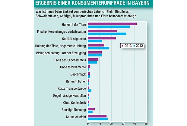 In einer Umfrage in Bayern ordneten die Konsumenten die Futtermittelherkunft deutlich hinter anderen Kriterien ein.