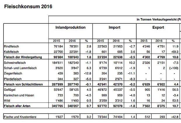2016 ist die Fleischproduktion um 0.7 Prozent auf 348‘057 t Verkaufsgewicht gestiegen. Trotz eines Rückgangs um 1,1% machten die Schweine mit 182‘540 t den grössten Teil aus, gefolgt vom Rindfleisch mit 78‘351 t (+2,8%).