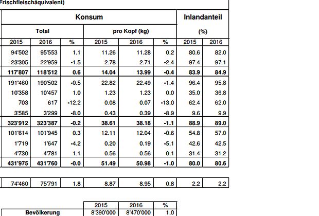 2016 wurde in der Schweiz pro Kopf 50,98 Kilo Fleisch gegessen, rund ein Prozent weniger als 2015. Am beliebtesten ist nach wie vor das Schweinefleisch. Erstmals seit Jahren rückläufig war der Geflügelfleischkonsum.