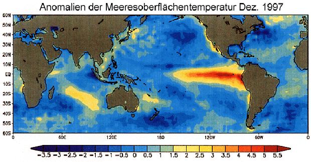 El Niño tritt unregelmässig, aber oft gegen Jahresende auf und führt unter anderem dazu, dass der Pazifik vor der Westküste Südamerikas wärmer wird und vor der Ostküste Australiens und Indonesiens kälter.