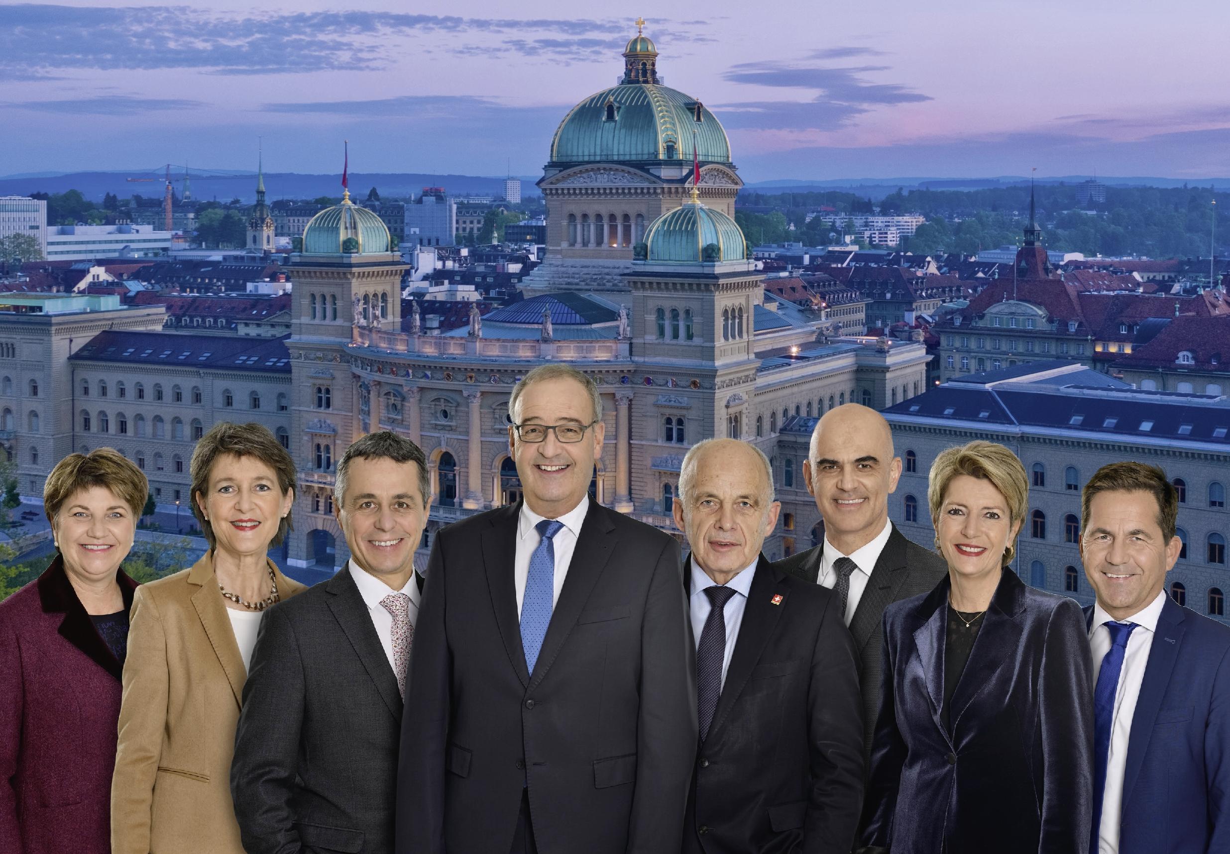 Auf dem Foto ist Parmelin in der Mitte stehend in Szene gesetzt, flankiert von Ignazio Cassis, dem Vizepräsidenten des Bundesrats, und von Finanzminister Ueli Maurer. Zu der Männergruppe im Zentrum gehört auch Bundesrat Alain Berset. Die Bundesrätinnen Viola Amherd, Simonetta Sommaruga und Karin Keller-Sutter sind am Rand positioniert, ebenso Bundeskanzler Walter Thurnherr.