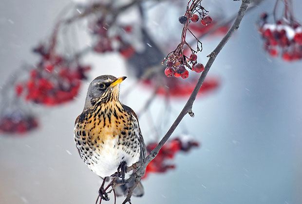 Beim Fotowettbewerb 2012 der Vogelwarte Sempach hat ein Trupp Wacholderdrosseln abgeräumt. Das Bild der wenig bekannten Vögel auf einem verschneiten Beerenbusch machte das Rennen gegen mehr als 5600 weitere Fotos. Präsentiert wurde es am Samstag anlässlich der jährlichen Mitarbeitertagung der Vogelwarte.