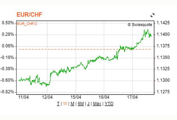 Der Euro setzt seinen Ende März gestarteten Höhenflug zum Franken fort und überwindet erstmals seit Anfang Februar die Hürde von 1,14 Franken. Der Schwächetrend des Frankens könnte Devisenhändlern zufolge durchaus noch anhalten.