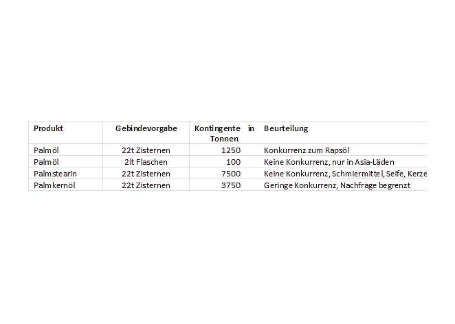 «In Konkurrenz zum Schweizer Rapsöl steht einzig das Teilkontingent von 1250 Tonnen rohem Palmöl, also lediglich 10 Prozent der gesamten Kontingente.» 100 Tonnen in Flaschen würden kulturbedingt in Asia-Shops verkauft. Ganze 7500 Tonnen, also 60 Prozent des Kontingents, würden auf Palmstearin fallen, so Röösli (siehe Tabelle). Das werde für die Herstellung von Seifen, Kerzen und Schmiermitteln verwendet und sei für unser Speiseöl keine Konkurrenz. Palmkernöl werde aufgrund seines hohen Schmelzpunktes für Pralinenfüllungen oder Desserts eingesetzt. Die Konkurrenzierung mit Rapsöl und Butter sei hier sehr gering.