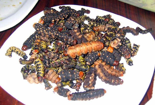 Im Vergleich zu Kiviak mutet die frittierte Raupe der Kaisermotte (Gonimbrasia belina), die angeblich in Südafrika traditionelle Weihnachtsspeise ist, direkt appetitlich an.