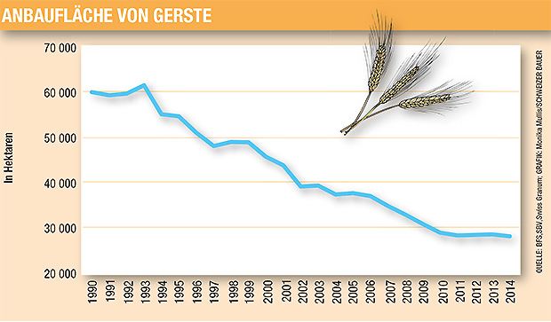 Weil wegen Auswuchses erhebliche Mengen Brotweizen deklassiert werden müssen und die Gerstenerträge erfreulich waren, steht 2014 zwar eine höhere Inlandmenge zur Verfügung. Der langfristige Trend ist aber klar negativ: Die Anbaufläche von Futtergetreide ist in den letzten 20 Jahren um 40 Prozent zurückgegangen.