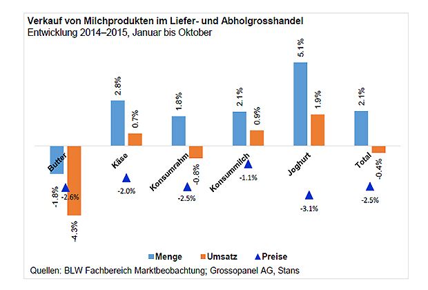 In der Schweiz hat zwischen Januar und Oktober 2015 die Gastronomie 2,1 Prozent mehr Milchprodukte als im Vorjahreszeitraum gekauft. Im Detailhandel wurde hingegen weniger verkauft.