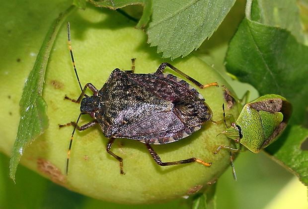 Die Marmorierte Baumwanze (Halyomorpha halys) stammt aus Asien. Der erste Fund in der Schweiz wurde 2004 registriert. Laut Agroscope stellt sie eine ernstzunehmende Gefahr für die landwirtschaftliche Produktion dar. Wählerisch ist die Wanze nicht: Sie bedroht Obst, Beeren, Gemüse, Mais, Soja und Reben. Ihr gesamtes Nahrungsspektrum umfasst rund 200 Pflanzen. Erste schwere Schäden gab es 2015 im Tessin, 2017 im Kanton Zürich. Die Schäden entstehen vor allem, weil die Wanze an den Früchten saugt. Die Marmorierte Baumwanze zu bekämpfen ist schwer, denn sie ist sehr mobil und Insektizide wirken nur bedingt. Derzeit laufen Forschungsarbeiten, um den Schädling besser bekämpfen zu können.