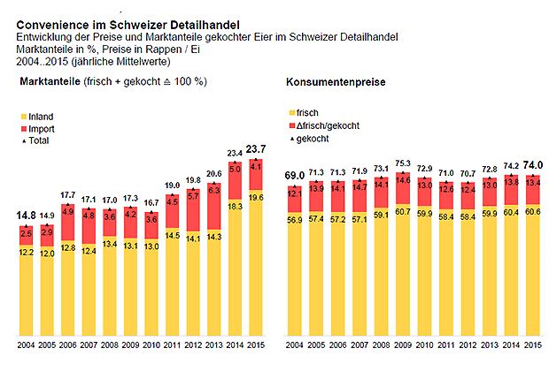 Die Konsumenten mussten im Verhältnis zur Preisentwicklung frischer ungekochter Eier nicht wesentlich tiefer in die Taschen greifen. Die Preise für gekochte Eier von 2014 bis 2015 um 5 Rappen (+7,2 %) pro Ei gestiegen (2004: 69 Rappen vs. 2015: 74 Rappen). Die Preisentwicklung verläuft im ähnlichen Rahmen wie jene von frischen Eiern (+6,5 %).