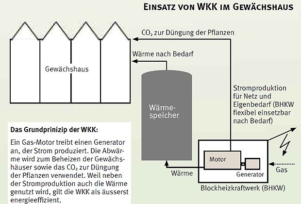 Zudem können WKK-Anlagen dann Elektrizität produzieren, wenn diese besonders gefragt ist. Die Wärme wird in Wärmespeichern gespeichert, bis sie zur Beheizung des Gewächshauses benötigt wird. Ein kurzfristiges „Stromdefizit“ im Netz kann so durch rasches Einschalten ausgeglichen werden. WKK-Anlagen würden deshalb dem angestrebten Konzept der dezentralen Stromversorgung sehr gut entsprechen, so der Verband. Einige Projekte seien jedoch wegen den hohen Kosten auf Eis gelegt. In den Niederlanden würden WKK-Anlagen seit Jahren einen „beträchtlichen“ Teil des Strombedarfs decken.