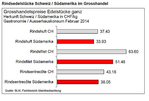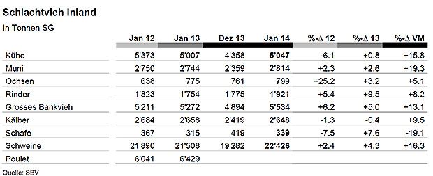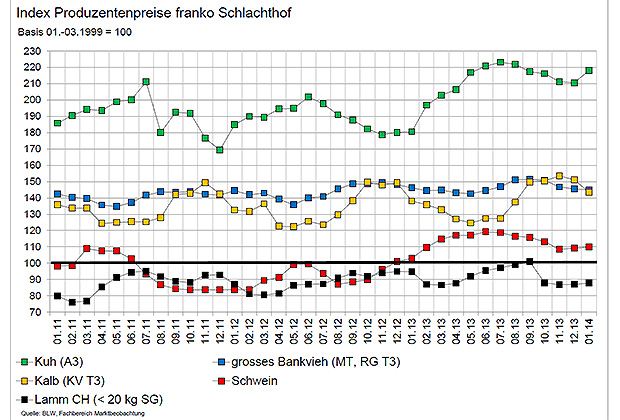 Auf den Schlachtviehmärkten herrscht vor allem im Schweine- und Kuhfleischsegment eine erfreuliche Marktsituation. Der Produzentenpreise bei den Schweinen lag im Januar trotz höherem Schlachtaufkommen 30 Rappen über dem Vorjahreswert. Für Kühe erhielten Bauern im Januar 2014 im Vergleich zum Vorjahr über 20 Prozent mehr pro Kilo Schlachtgewicht.