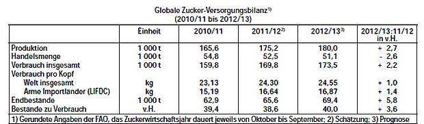 Die Ernährungs- und Landwirtschaftsorganisation der Vereinten Nationen (FAO) rechnet auch für die zweite Jahreshälfte mit Preisdruck und verweist auf den erneuten Produktionsüberhang im laufenden Wirtschaftsjahr. Ihrer aktuellen Schätzung zufolge zeichnet sich für die noch bis Ende September dauernde Saison 2012/13 eine globale Rekordproduktion von 180 Mio. t Zucker ab, was imVergleich zum Vorjahr eine Steigerung um 4,8 Mio. t (+3%).