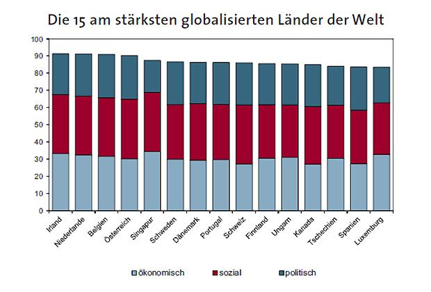 Die Schweiz machte damit gegenüber dem Vorjahr zwei Plätze gut. Der Globalisierungsindex misst die wirtschaftliche, soziale und politische Dimension der Globalisierung in 187 Ländern mit Daten aus dem Zeitraum von 1970 bis 2012.