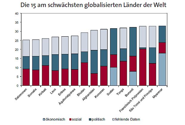Die Salomonen waren laut dem Index am wenigsten globalisiert, gefolgt von Somalia, Kiribati, Laos und Eritrea. Die grossen Volkswirtschaften der Welt wie die USA, China, Japan und Deutschland liegen im Mittelfeld. Diese Staaten seien wegen ihrer Marktgrösse stärker nach innen gerichtet, erklärte die KOF.
